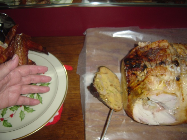 A slice is taken off the turducken, revealing various stuffing strata within.