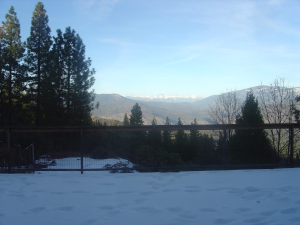 Comments: The view from the Youngs' deck. The line of snowy peaks in the distance is the Ritter Range, featuring the tallest peak, Mt. Ritter. Those mountains are about 35 miles away; that gives you an idea of how clear the air is.