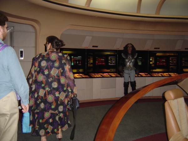 Guests and Klingon on the bridge.