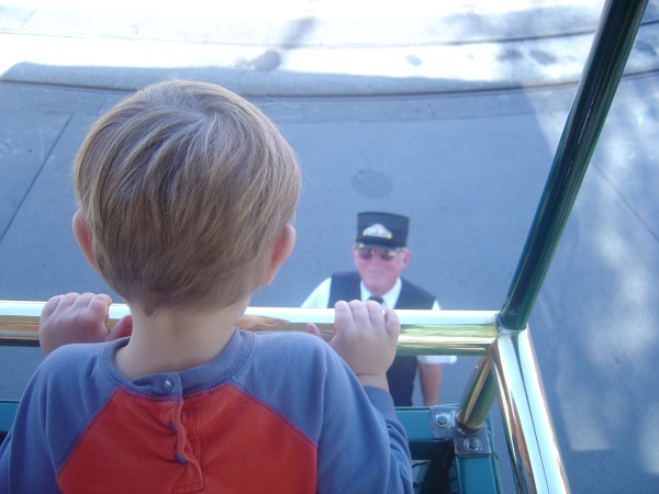 Okay, not really, we were atop the omnibus that cycles between Town Square and the Hub. Here, Donovan looks down at one of the conductors from our train, who seemed to be stalking us...