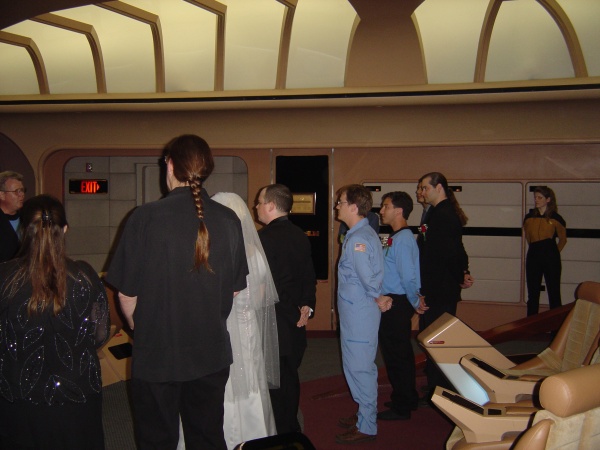 The wedding party lines up and listens to the Captain of the Starship Enterprise (who might also do Elvis weddings on his off days).