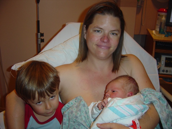 Monica hugs her sons. (And wishes someone would arrange her gown for her, since she clearly has her hands full.)