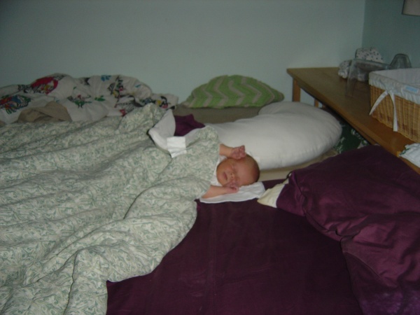 Tiny baby, huge bed. (Yes, yes, he's supposed to be "back to sleep" but he invariably wakes up if we do that.)