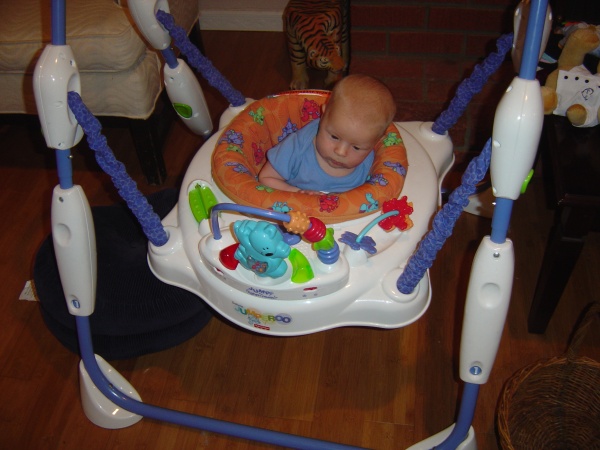 Raphael is still a bit small for the Jumperoo, but he likes staring at the toys.
