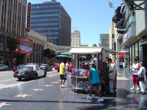 Looking west along Hollywood Blvd. Monica is visible at right, trying to get change for a $20 so we can buy MTA day passes.