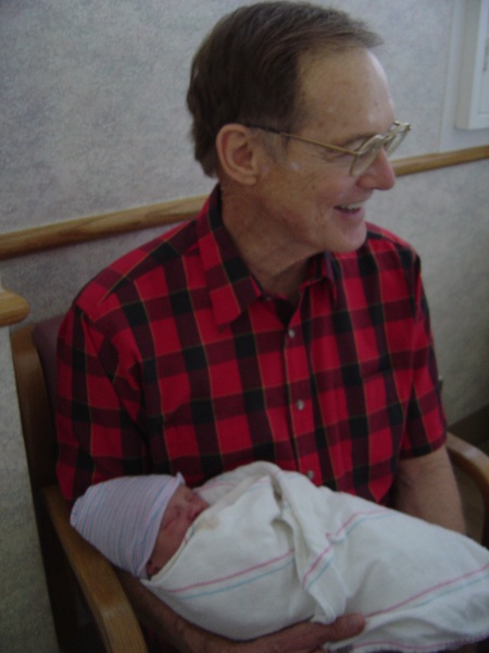 Step-Grandpa Harvey holds sleeping Donovan. Now we've moved into the postpartum room, where we'll be for the next two or three days.