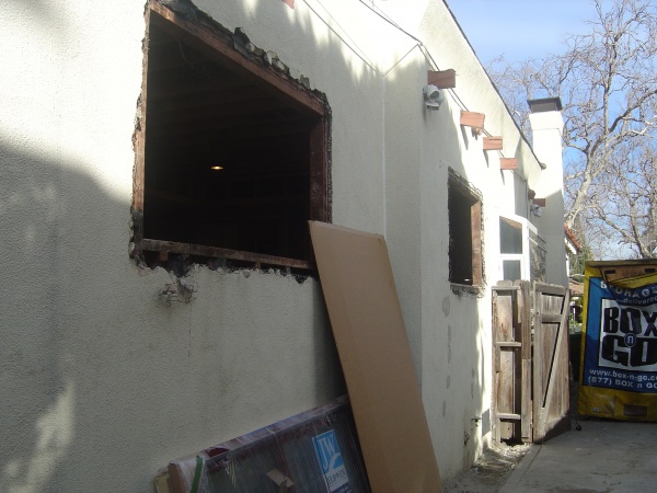 The exterior shot of the family room and kitchen window openings, seen from the driveway.