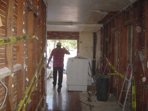 Comments: Here's the view from the dining room door. The face of the kitchen wall we're removing (on the left) has already been demolished, as has the pantry and closet that were on the right. Jesus, right-hand man to Aaron, our framing etc. contractor, walks toward the back door. The laundry machines are out of position so that the workers were able to demolish the cabinetry around them.