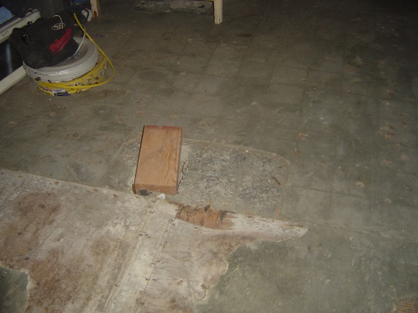 After that, they put linoleum down on the whole floor. Sometime later, tired of the linoleum, they put red and green plaid carpet over it (apparently even in the kitchen). That didn't last, though; after that, someone put in ship's-plank style hardwood. Under that, probably to level it, they laid down new plywood subfloor.