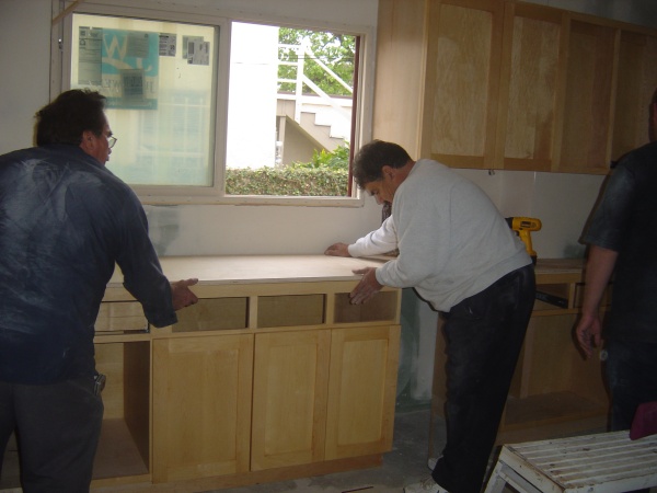 OMG CABINETS! Sergio and his team fit the countertop onto the newly-installed kitchen cabinets. They're maple with a clear seal, no stain.