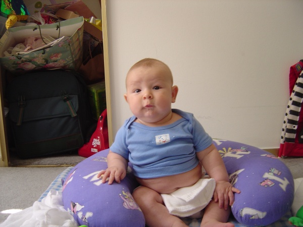 Donovan can't sit up on his own yet, but he can for brief periods when supported by his Boppy.