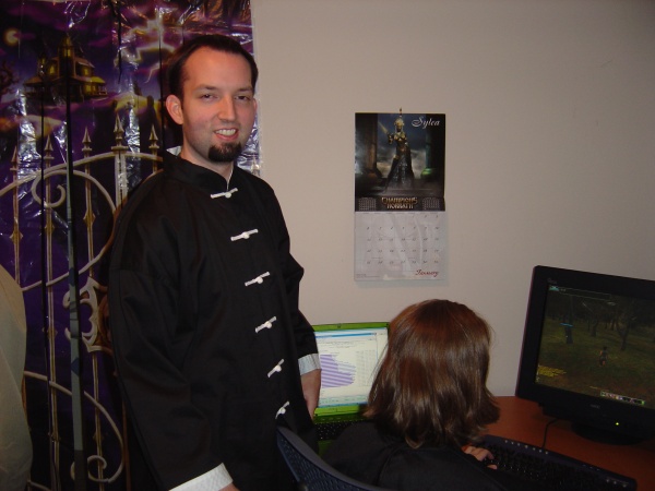 Cory uses kung fu to guard Snarkie while she plays EverQuest 2.