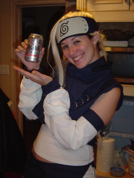 Marissa demonstrates Asahi beer. Asahi: Japanese for "Foster's".