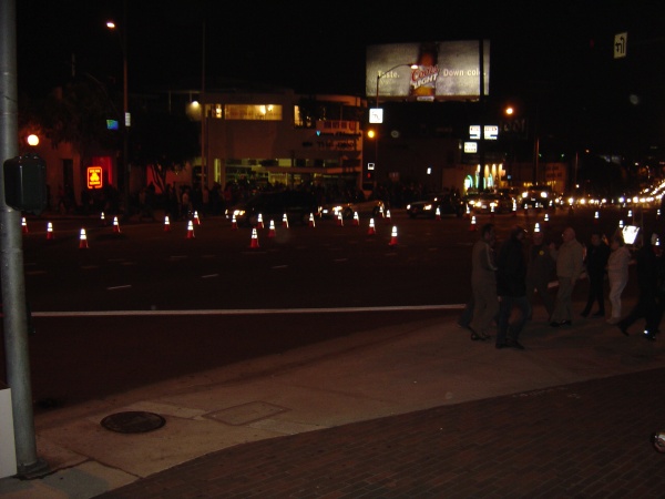 The intersection of Santa Monica Bl. and La Cienega Bl., looking southeast. Lots of cones.