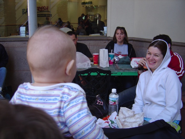 L to R: Cory, Snarkie, John (in red), and Sars stare at the baby in awwwww.