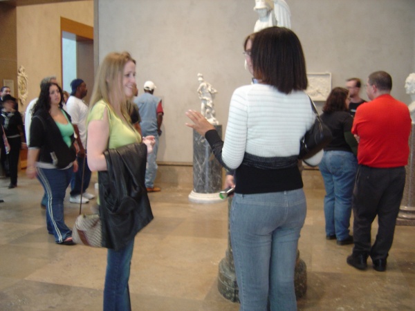 Laura, a small slice of Edgar, and Jan share conversation in front of some Greek deity.