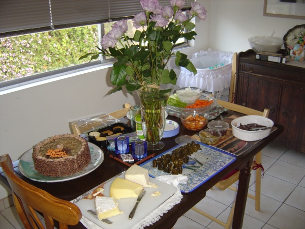 Comments: Mmm... food. From leftish to rightish: German chocolate birthday cake, cracker assortment, various cheeses, dolma, lettuce and carrot sticks with dip, beans, olives, and rum raisin fudge. Mmm...